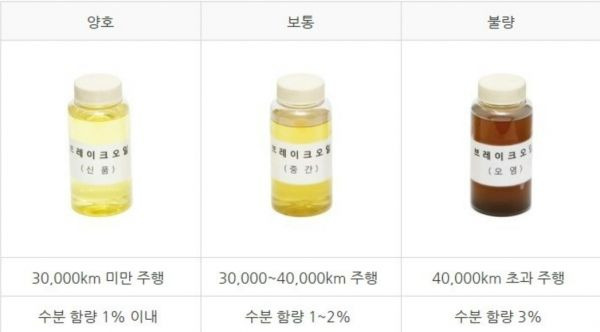 브레이크 오일의 상태는 색상과 점도를 통해 확인할 수 있습니다. 일반적으로 새로운 브레이크 오일은 투명한 노란색을 띠고 있습니다. 시간이 지나면서 색이 어두워지고 점도가 떨어지면 교체가 필요합니다.